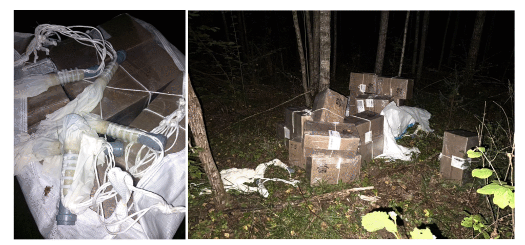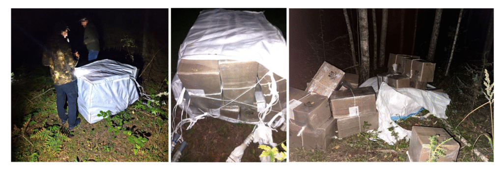 Tą pačią naktį kiek vėliau Varėnos rajone į pasieniečių rankas pateko dar 21 dėžė kontrabandinių cigarečių, į Lietuvą iš Baltarusijos irgi skraidinta tokiame didmaišyje su šešiais oro balionais.