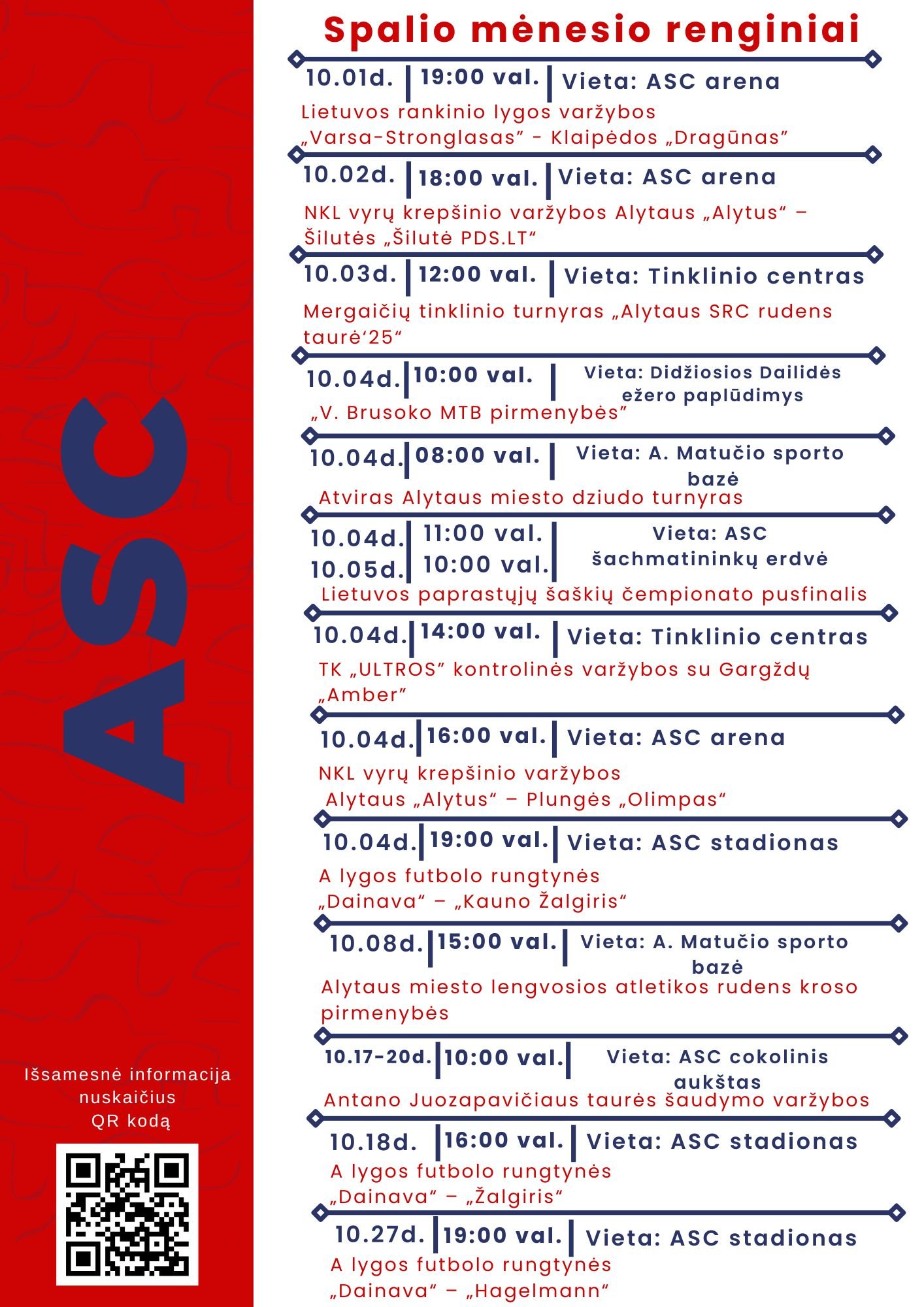 Gyvenimas Kokie renginiai spalio mėnesį vyks Alytaus sporto centre? Autorius: Alytaus sporto centro informacija Publikuota 2025-10-01 Komentarų: 1 Alytaus sporto centras (ASC nuotr.) Dalintis Spalio mėnesį Alytaus sporto centre – gausu renginių. Kviečiame dalyvauti! Grafiką pateikiame žemiau. ŽYMOS:Alytaus sporto centrasrenginiai Alytujevaržybos Alytuje Komentarų: 1 valio…galėtumėt ir dažniau skelbti: kada ir kur kas Alytuje vyksta….ypač aktualu pensinykam, kurie turi laiko ir noro kurnors ,,nusidaužt” Atsakyti Parašykite komentarą Atšaukti atsakymąEl. pašto adresas nebus skelbiamas. Būtini laukeliai pažymėti *Komentaras * Vardas El. pašto adresas Interneto puslapis Rekomenduojami Video Reklama