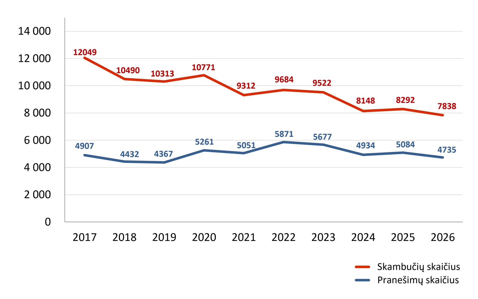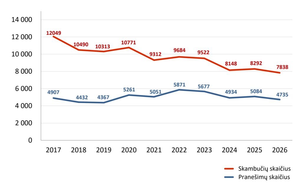2026 metų sausio 1-ąją Bendrajame pagalbos centre užregistruoti 7 838 skambučiai, parengti ir skubiosios pagalbos tarnyboms perduoti 4 735 pranešimai apie pagalbos poreikį. Lyginant su ankstesniais metais, tai kol kas mažiausias pirmąją Naujųjų metų dieną užfiksuotas skambučių skaičius.