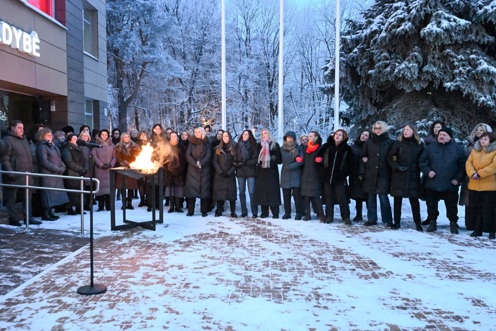 Darbuotojai susirinko prie savivaldybės įėjimo tyliai ir prasmingai bendrystei, liudijančiai Sausio 13-osios įvykių svarbą Lietuvos laisvės keliui, pagarbą ir atmintį laisvės gynėjams.