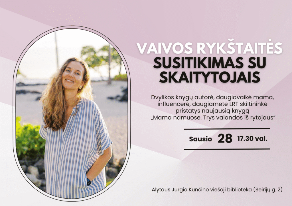 Sausio 28 d. 17.30 val. Alytaus Jurgio Kunčino viešojoje bibliotekoje (Seirijų g. 2) svečiuosis ypatinga viešnia, kuri į Lietuvą atvyksta net iš Havajų.Vaiva Rykštaitė – dvylikos knygų autorė, daugiavaikė mama, influencerė, daugiametė LRT skiltininkė, emigrantė susitikimo metu pristatys ir naujausią savo knygą „Mama namuose. Trys valandos iš rytojaus“.