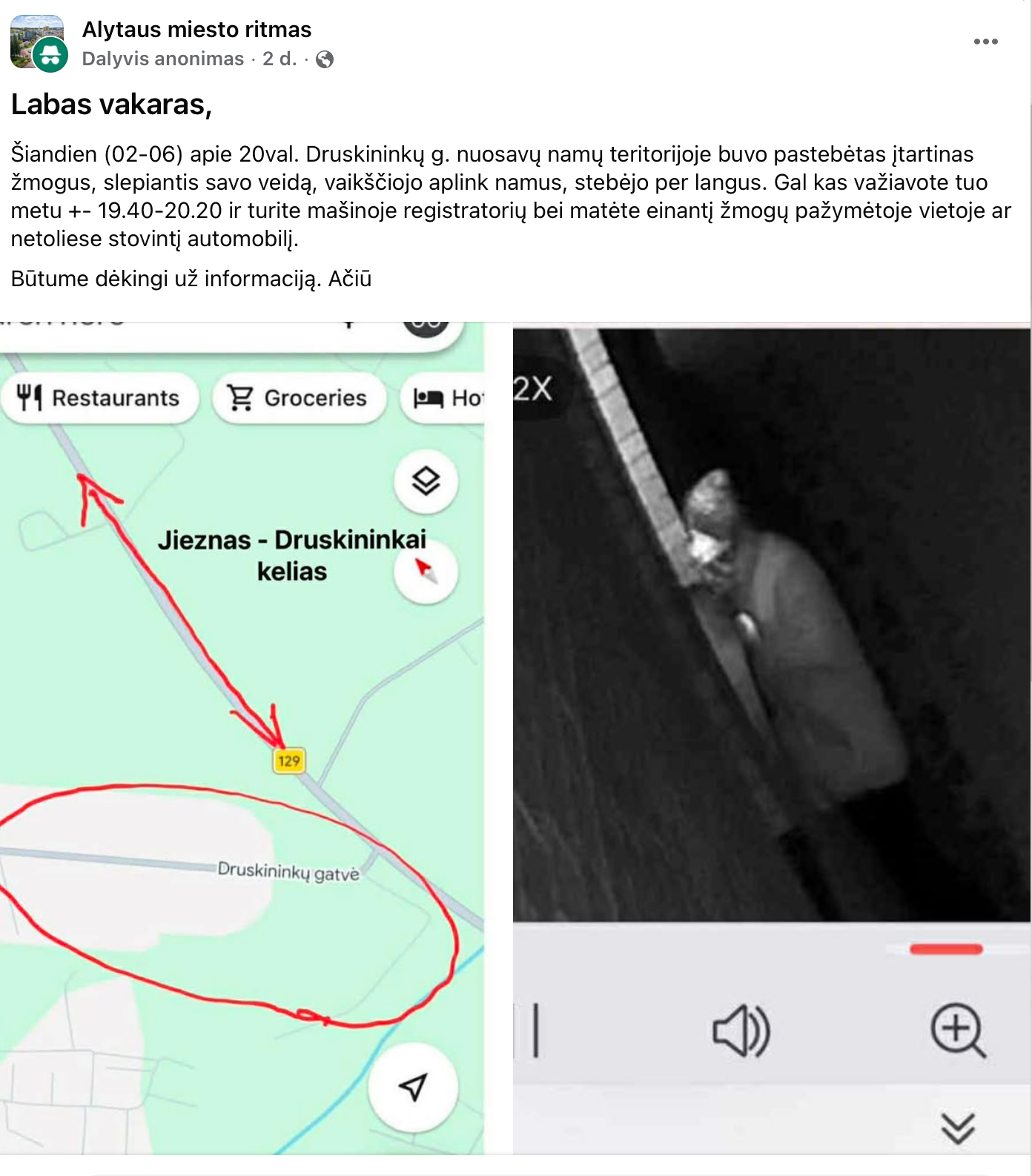 Po pastarojo įvykio moteris pasidalijo informacija socialiniuose tinkluose bei bendruomenės „Druskiai“ vidinėje grupėje. Ji paviešino ir neryškų kamerų užfiksuotą vaizdą.