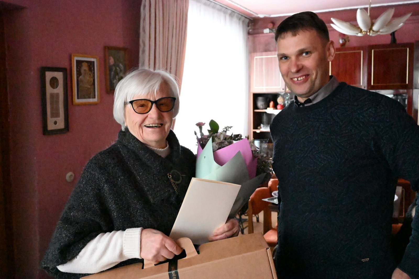 Jas perdavė Alytaus seniūnijos seniūnas Kęstutis Tumynas. Jis linkėjo jubiliatei ir toliau išlikti aktyviai, dainuoti, stiprios sveikatos ir daug džiaugsmo. „Būkite sveika, tegul Jus supa patys artimiausi ir brangiausi žmonės“, – kalbėjo seniūnas.