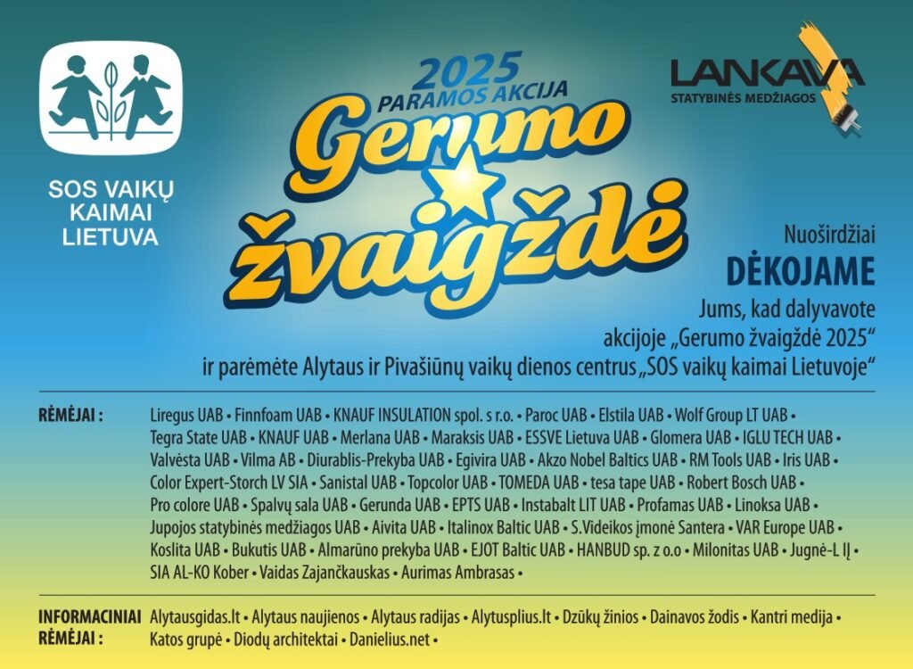 Bendrovės „Lankava“ inicijuota paramos akcija „Gerumo žvaigždė“ surinko 9 600 eurų, kurie skirti SOS vaikų kaimai Lietuva Alytaus ir Pivašiūnų vaikų dienos centrams. Parama padės gerinti daugiau nei 50 vaikų kasdienę aplinką ir ugdymo sąlygas.