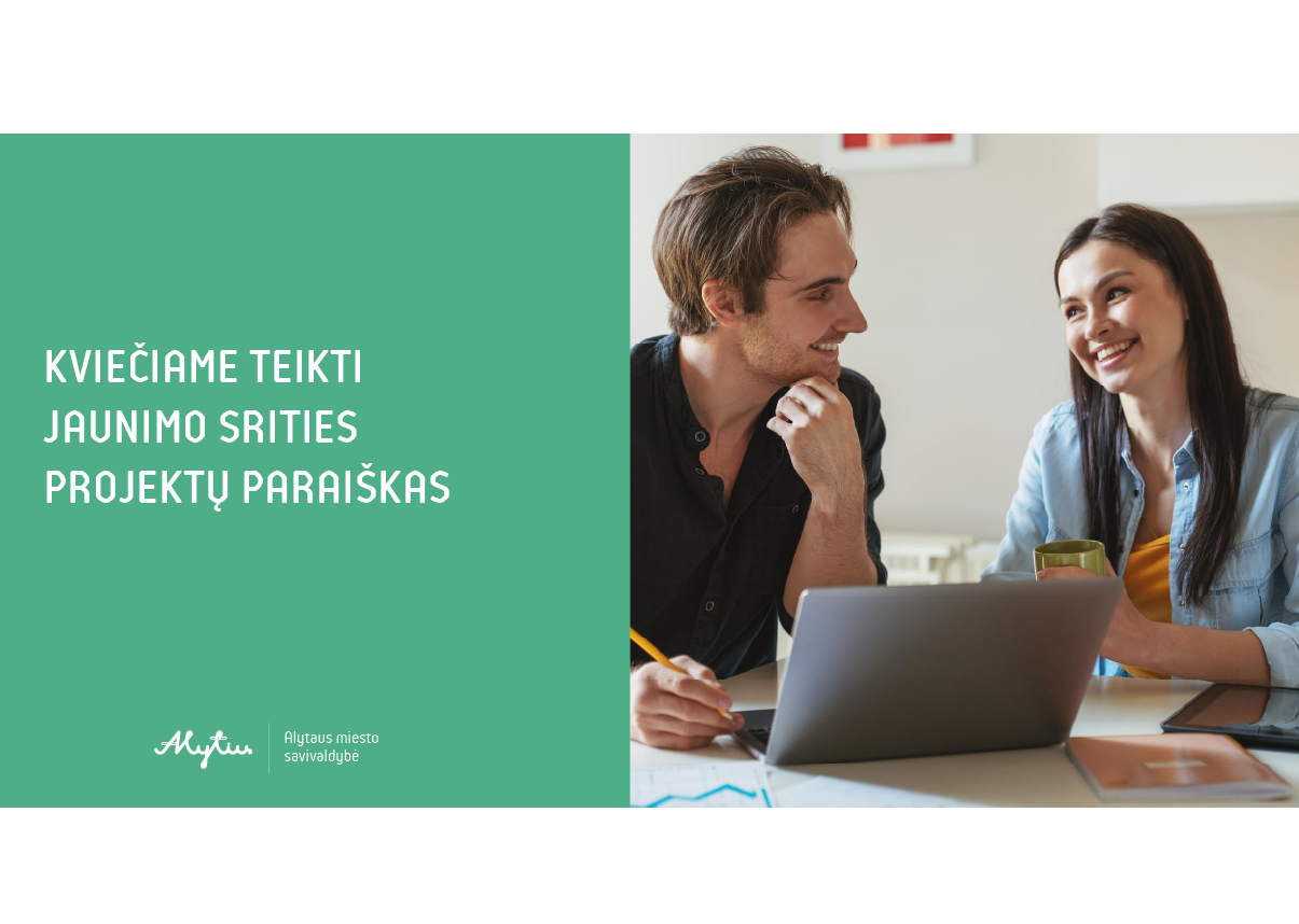 Alytaus miesto savivaldybės administracija, vadovaudamasi Alytaus miesto savivaldybės jaunimo srities projektų paraiškų teikimo, atrankos konkurso ir finansavimo tvarkos aprašu, patvirtintu Alytaus miesto savivaldybės tarybos 2022-12-22 sprendimu Nr. T-390 „Dėl Alytaus miesto savivaldybės jaunimo srities projektų paraiškų teikimo, atrankos konkurso ir finansavimo tvarkos aprašo patvirtinimo“, kviečia jaunimo ar su jaunimu dirbančias organizacijas teikti projektines paraiškas, kurioms finansuoti skiriama iki 100 proc. Alytaus miesto savivaldybės biudžeto lėšų.